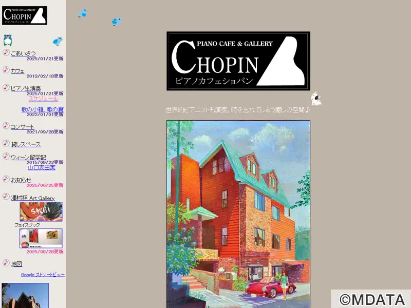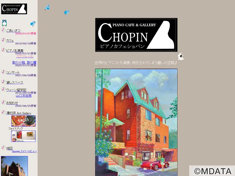 小野路の里山にあるピアノカフェ・ギャラリー。緑に囲まれた赤い壁の一軒家で、コーヒー・紅茶を飲みながらピアノの生演奏を聴けるお店。1階にギャラリーショップ、2階にグランドピアノを常設したリビングカフェがあり、クラシックを主体としたピアノ生演奏(ドリンク付き)やコンサートを開催している。また、ピアノ発表会やミニコンサート、練習会場としてレンタルスペースも可能。多摩センター駅からバスで約13分、駐車場完備。