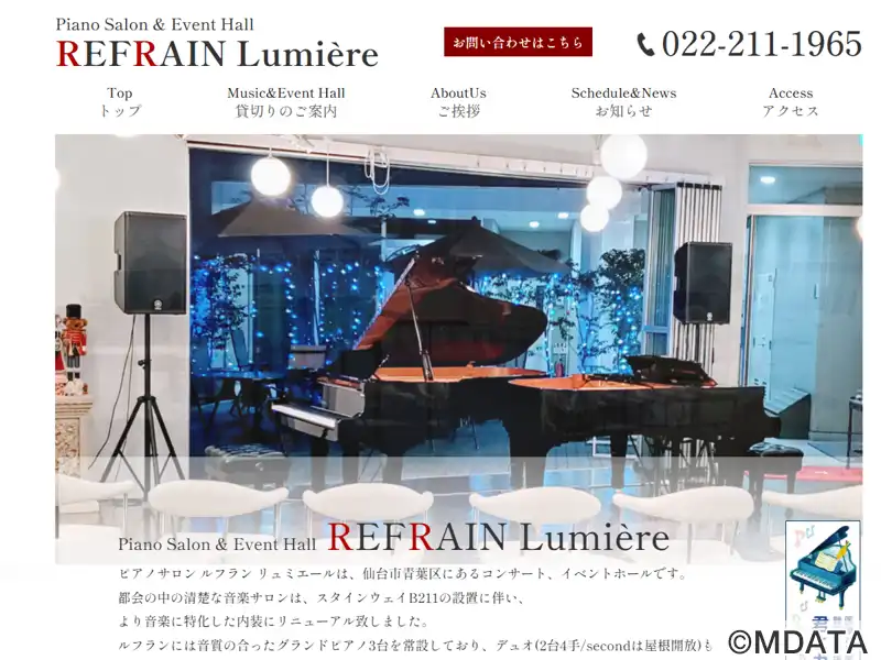 仙台市青葉区にあるピアノサロン・イベントホールとして利用できるティーラウンジ。最大88名まで収容可能で、コンサートや音楽イベントに貸し切ることができる。2台のグランドピアノ(ヤマハC6・S4)を備えデュオ演奏にも対応。ピアノは調律師によって常に最良のコンディションに保たれている。バリアフリー設計で車椅子利用者や盲導犬同伴者も安心して利用できる。都会のオアシスとして、音楽、スイーツ、ランチを楽しめる。