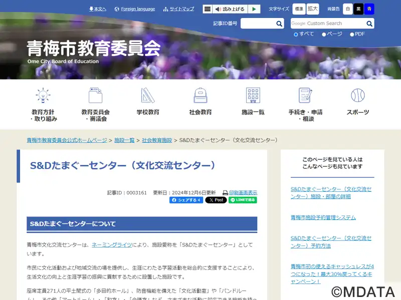 旧青梅市民会館の跡地に2019年4月オープンした生涯学習施設。電動昇降ステージを有する平土間式の多目的ホール、音楽練習に適した防音の文化活動室(Aグランドピアノ、Bアップライトピアノ常設)、バンドルーム、アートルーム、研修室、和室、会議室などさまざまな活動に対応する機能を備えている。S&D多摩ホールディングス株式会社が命名権取得により2023年4月より現愛称を使用。正式名称、青梅市文化交流センター