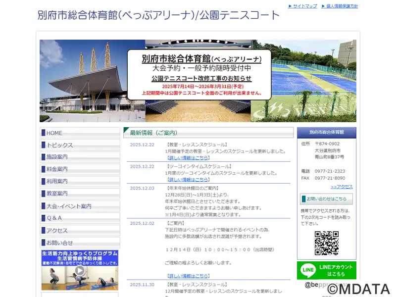 2005年に開館した別府市総合体育館。第63回国体(2008年)では、バレーボール・体操競技の会場に使用された。メイン・サブ一体となった広いアリーナ空間で、メインアリーナはバスケットボール3面、バレーボール4面、バドミントン16面の競技スペースを完備。トレーニング室も用意され、スポーツ教室からプロリーグ公式戦まで幅広く利用されている。2023年10月から天井と床の改修工事を行い2025年4月リニューアル。