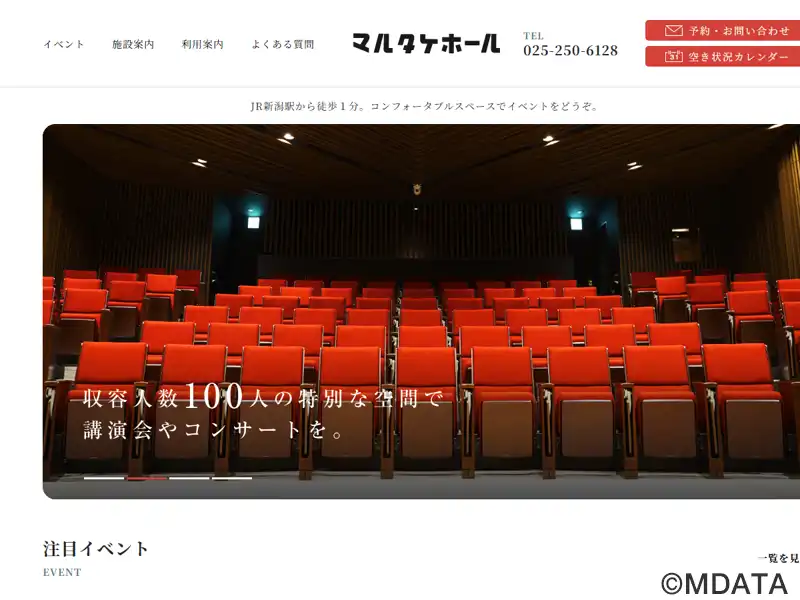 新潟駅(万代口)駅前に2020年4月リニューアルオープン。オフィスビルに加えてホールやコミュニティ機能を併せもつ新生マルタケビル。レストランを併設した8F最上階にはマルタケホールを新設。音響にこだわった100席のサロン型ホールにはスタインウェイのグランドピアノB-211完備。ステージ間口5.8m、奥行き3m。利便性抜群のロケーションで、コンサートやビジネス・カンファレンスなど各種イベントに対応。