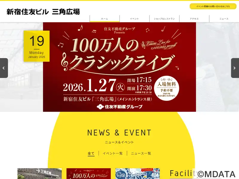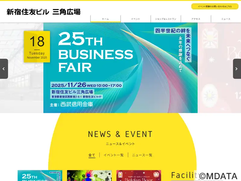 新宿超高層ビル群の中で、日本初の200m超えビル(1974年3月当時)として存在感を放つ三角柱状新宿住友ビルのグラウンドレベルに、2020年7月竣工した全天候型イベントスペース。最大高25mの総ガラス張り天井をもつアトリウム広場に、564インチ4K巨大ビジョン完備。飲食ブースも自在に設置可能でエンタメ系からスポーツイベント、パブリックビューイング、フードフェス、展示など各種イベントが開催されている。