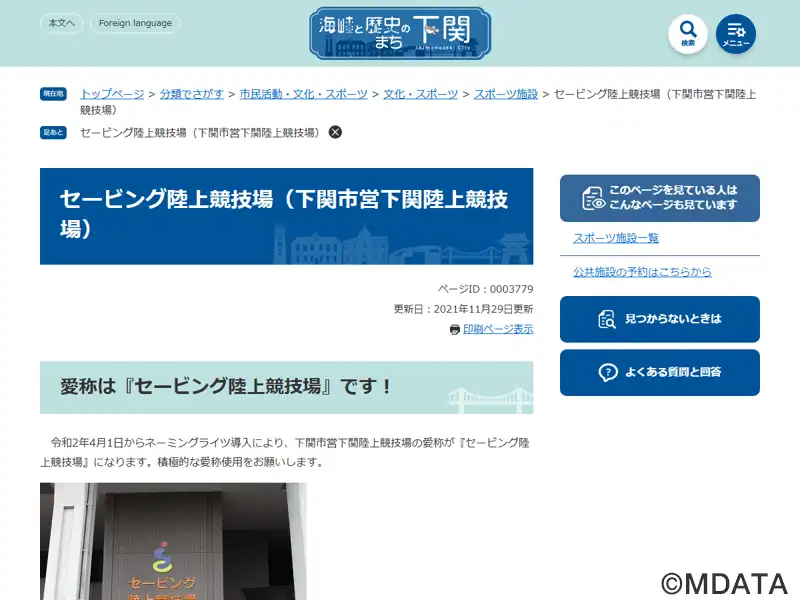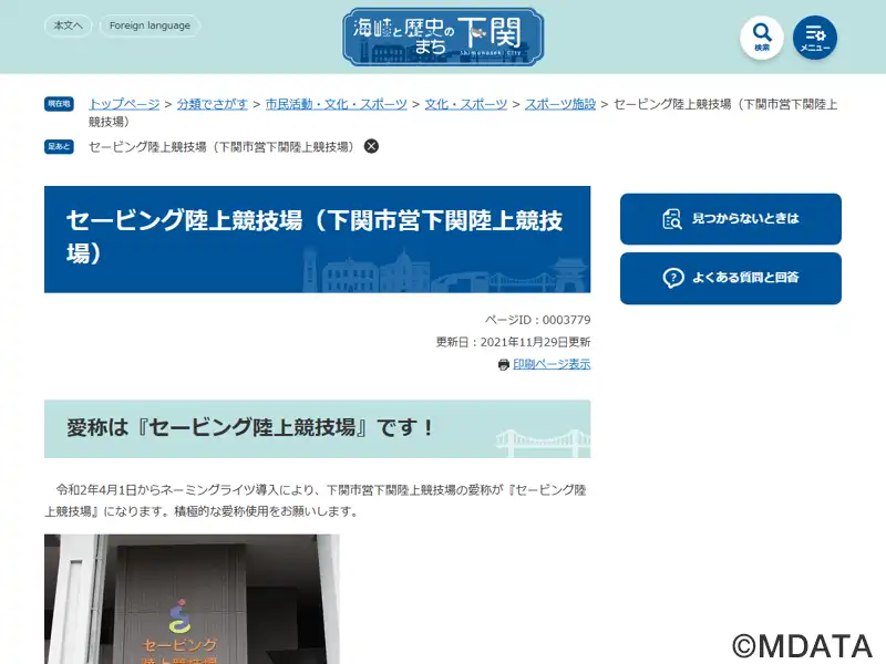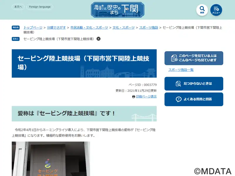 山口県の下関運動公園にある日本陸連第2種公認の陸上競技場。1958年開場、2019年に全面改修リニューアルを実施。全天候型の400mトラック×8レーン、跳躍・投てき競技用設施設や、屋内練習場、トレーニングルームも併設する。また、天然芝フィールドは、レノファ山口FC、FCバレイン下関の公式戦や、全国社会人サッカー選手権大会が開催される。2020年から株式会社セービングの命名権取得により現愛称となる。