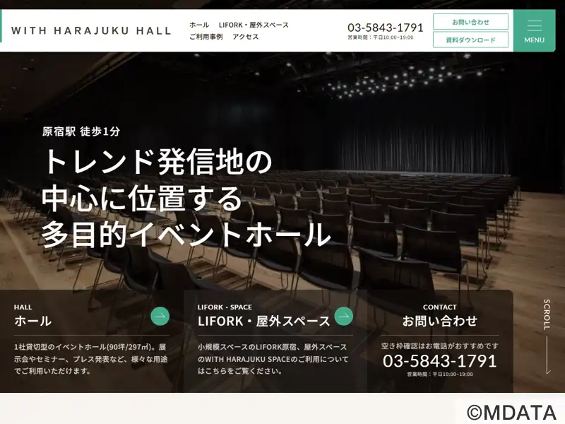 東京・原宿駅前に2020年に開館した多目的イベントホール。天井高6mの開放的な空間に、高さ調整が可能な仮設ステージを備え、シアター形式では最大300席の設営が可能。LED照明、レーザープロジェクター、400インチスクリーンを完備し、展示会やパーティー、セミナー、ファッションショーなど多様な用途に対応。スライディングウォールを活用することで約520㎡の広さを確保でき、ホワイエとの一体利用も可能。
