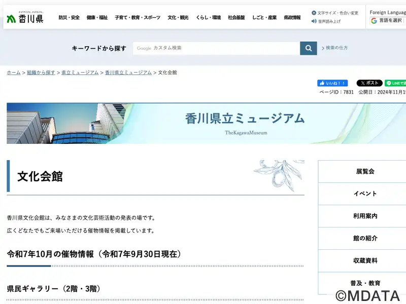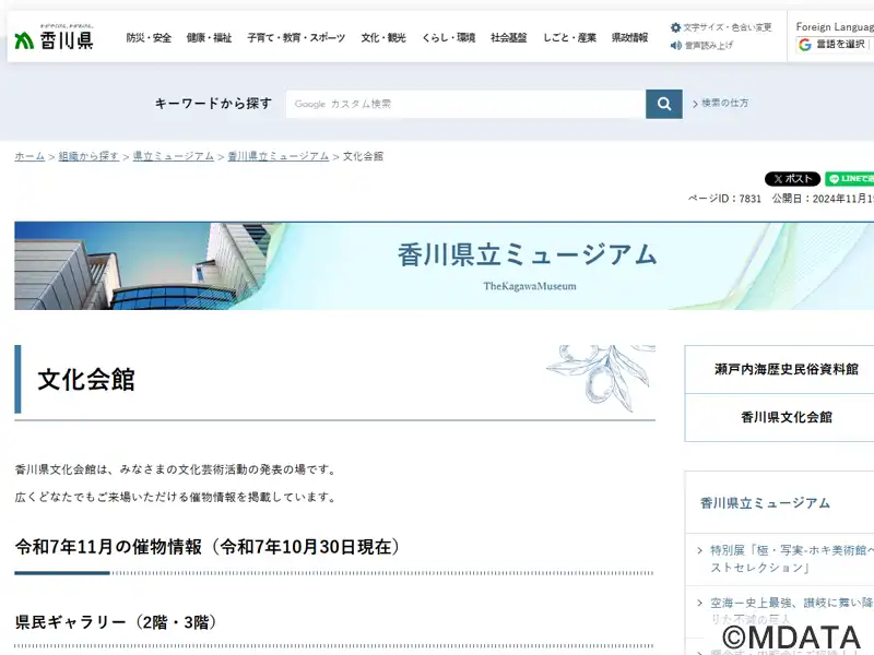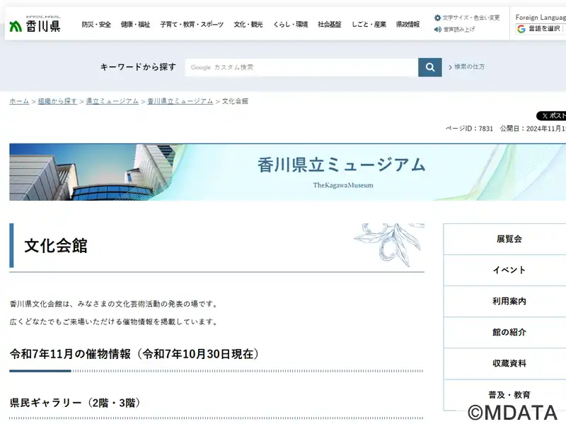香川県民の文化芸術活動の拠点として1966年に開館した文化施設。県庁前通りに位置する建物はモダニズムと日本伝統様式の「混在併存」を掲げた大江宏の代表作。2009年より香川県漆芸研究所との複合施設となり、1階には漆芸作品を常設展示する香川漆芸ホールが設置されている。2・3階に県民ギャラリー展示室と定員233人の芸能ホール、4階に和室・談話室があり、県民による展覧会や音楽発表会などが開催されている。