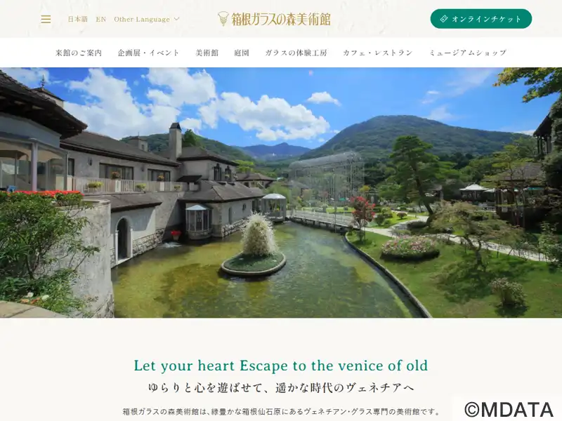 神奈川県箱根町仙石原に1996年開館したヴェネチアン・グラス専門美術館。中世ヨーロッパ風の建物に、歴史的な名品約100点を展示したヴェネチアン・グラス美術館と、現代作家の斬新な作品を紹介する現代ガラス美術館があり、古代から現代までのガラスアートを鑑賞できる。また、大涌谷を望む庭園やクリスタルガラスが輝くモニュメントが配置され、ガラス細工の体験工房、カフェレストランやミュージアムショップも併設する。
