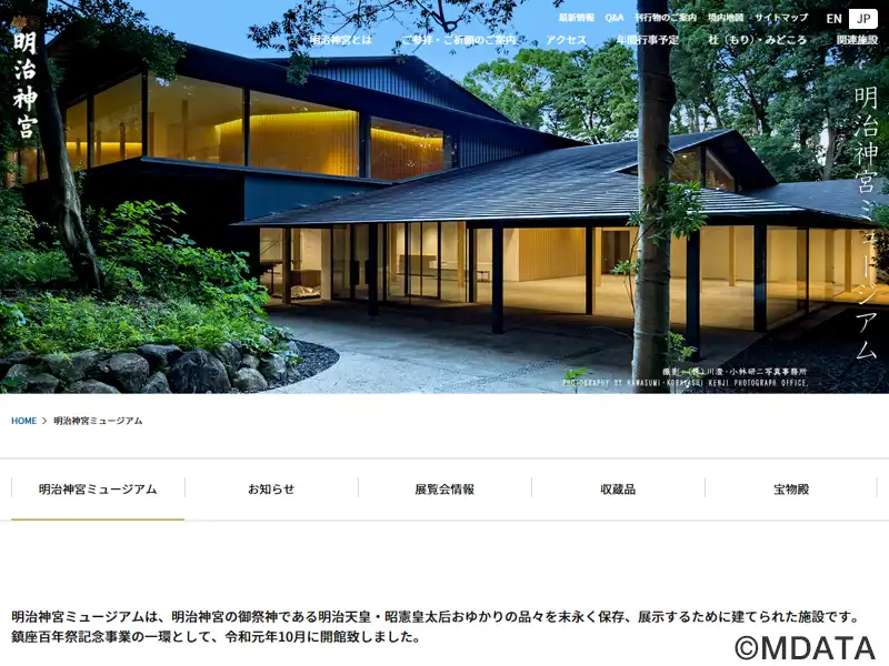 明治神宮鎮座百年祭記念事業の一環として2019年に開館した展示施設。杜と調和する入母屋造りの建物は隈研吾の設計。国の重要文化財として現存する「宝物殿」に納められていた御祭神ゆかりの品々を末長く保存、展示するための最新の設備が整えられ、1階では明治神宮の歴史や日々の営みを映像や資料で紹介。2階では明治天皇・昭憲皇太后の御尊影や六頭曳儀装車をはじめとする宝物、明治神宮所蔵の名品などが展示されている。