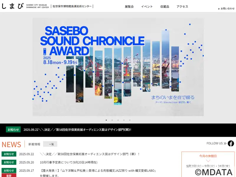 通称しまび。島瀬公園と一体となった博物館美術センターとして1983年開館。十二柱の神々のレリーフが外壁に鋳込まれたシンボリックな建物。企画展示室(中2階ギャラリー、2階・3階・4階展示室)、世界最古級の豆粒文土器や遺跡の遺物を展示した5階考古展示室があり、郷土ゆかりの作家作品、三川内焼など館蔵コレクション展や企画展、市民の展覧会のほか、グランドピアノ常設1階ロビーではミュージアムコンサートも開催。