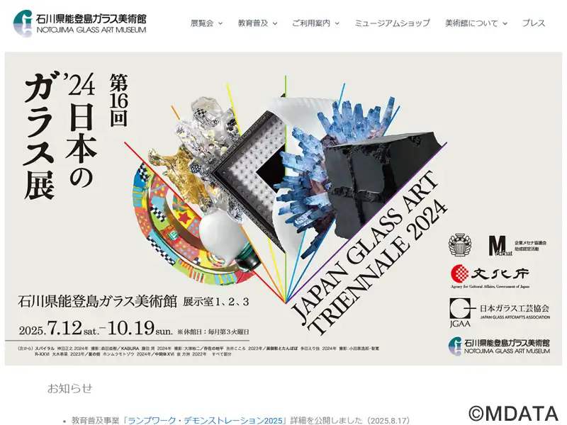 能登半島・七尾湾に浮かぶ自然豊かな能登島に1991年開館。国内初のガラスアート専門の公立美術館で、道の駅のとじまに隣接。四神を象徴する4棟を配した独創的な建築は毛綱毅曠の設計。館内装飾に漆塗りや九谷焼など石川県の伝統工芸とのコラボも。コレクションは中国清朝ガラス工芸、ピカソやシャガール等がデザインしたヴェネチア制作のガラス造形、ダリと仏ドーム社の共作ガラス作品、国内外の現代ガラスアートを収蔵。