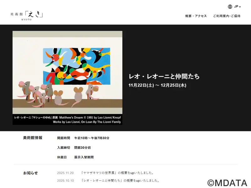 京都駅ビル内ジェイアール京都伊勢丹7階に隣接する美術館。駅直結の立地を生かし、京都の文化発信・情報発信を目指して駅ビル開業とともに1997年に開館した。絵画、工芸、写真、書、絵本、アニメ、ファッションなど多彩なジャンルを網羅し、幅広いテーマの展覧会を年間を通じて開催している。国内外の著名作家や人気キャラクターを扱う展覧会も多く、子どもから大人まで楽しめる構成となっている。大階段からも入場できる。