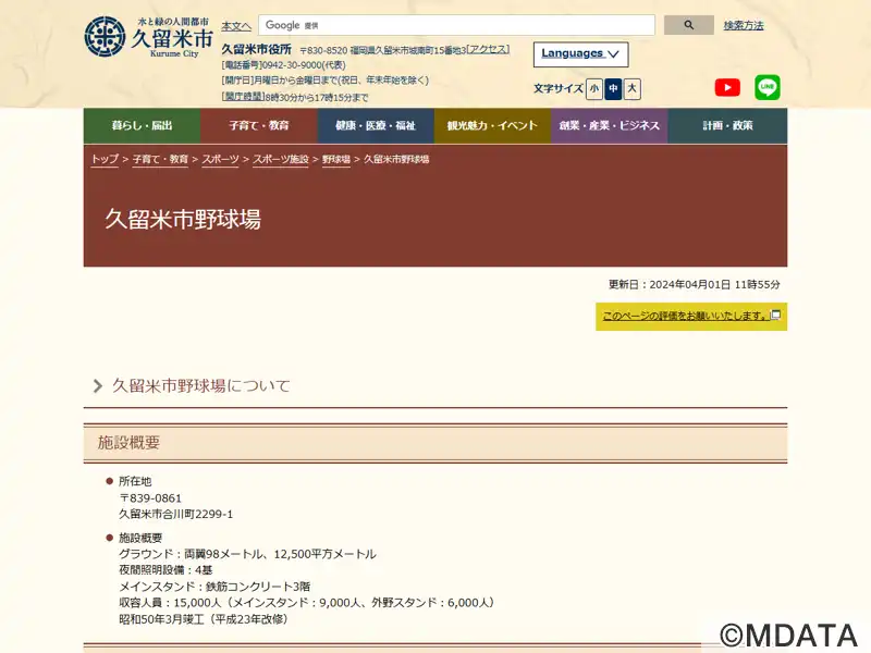 久留米市の中心街の中央公園南西部、久留米スポーツセンター内にある天然芝野球場。1975年竣工、1998年の改修にて両翼98メートルにフィールド拡大。2013年の大規模改修完了。スコアボードのLED化、スピードガン導入、ファールグラウンドに人工芝を導入し、ホームベース手前に「KURUME」のロゴ導入。主に学生やアマチュアの試合や練習利用され、全国高校野球福岡県大会やウェスタンリーグ公式戦が行われたこともある。