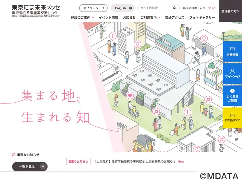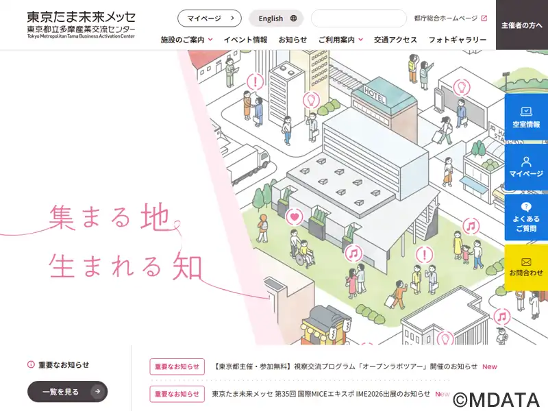 八王子駅近のれんが通り沿いに2022年10月オープン。『未来の東京』戦略ビジョン推進事業のひとつで、ビジネス・イノベーション拠点となる「東京都立多摩産業交流センター」愛称:東京たま未来メッセ。多摩地区最大級、約2,400㎡の無柱空間が広がる展示室(4分割可)、7つの会議室(50〜200㎡)や産業サロンを有し、先端技術ショーケース、大規模な展示会や商談会、学術会議など多目的に利用可能。