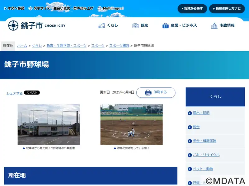 前宿町公園内に1950年に竣工した両翼92m、中堅118mの天然芝野球場。1973年の若潮国体や、2010年ゆめ半島千葉国体の高校野球競技の会場になり、主に学生やアマチュアの試合・練習で利用されている。東日本大震災の影響でナイター設備が損傷・撤去されたが、「JリーグTEAM AS ONE募金」により、鹿島アントラーズとフレンドリータウン協定を結ぶ銚子市にグラウンド用簡易照明が寄贈された。