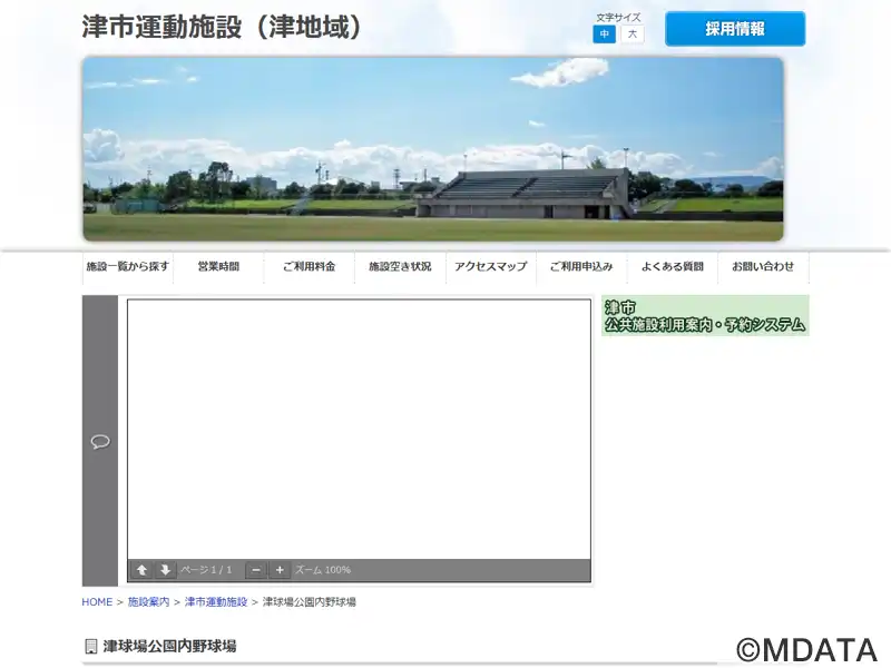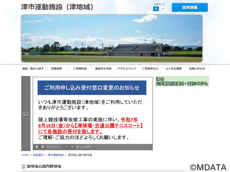 津球場公園内に1959年竣工した両翼91m、中堅119m、ナイター設備のある天然芝野球場。地域の歴史を紡ぐシンボリックな正面外装が特徴。第30回国民体育大会(1975年)会場。2010年、スピードガン付きLEDスコアボードに改修。2021年7月、観客席やフェンス、ダッグアウト等の大規模改修を経てリニューアルオープン。主に学生やアマチュア、全国高校野球選手権三重大会などに利用される。通称、津市営球場。