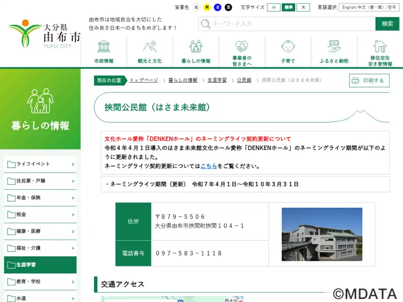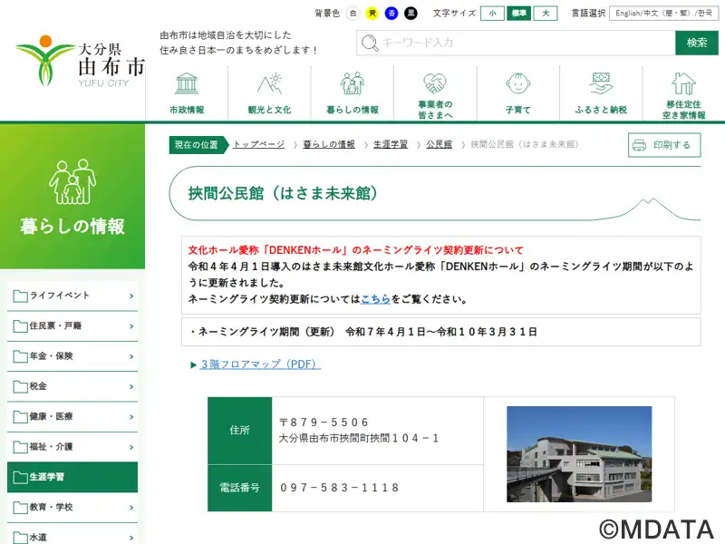 健康と文化の交流拠点、旧挾間町健康文化センター「はさま未来館」として2000年4月開館。2005年10月に3町合併で由布市が発足、由布市挾間健康センター・挾間公民館・由布市立図書館の複合施設となる。文化ホールはワインカラーの可動席500席、プロセニアム舞台(間口13m奥行12m)、ヤマハグランドピアノCFⅢS完備。軽スポーツなどフロア利用も可能。2022年4月より文化ホールにネーミングライツ導入。