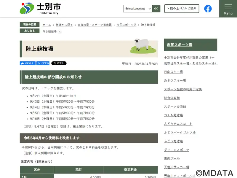 スポーツ合宿の里・士別市に1965年10月開場。1992年に全天候化改修した400mトラック8レーンをもつ第3種公認陸上競技場。世界陸上や五輪で採用されている高反発トラック・スーパーXによる走路舗装の部分改修を実施。サブグラウンドを隣接し、士別記録会やホクレン・ディスタンスチャレンジ士別大会、士別ハーフマラソン大会、市民クロスカントリー大会などが行われ、大会や練習、実業団の夏合宿にも利用される。