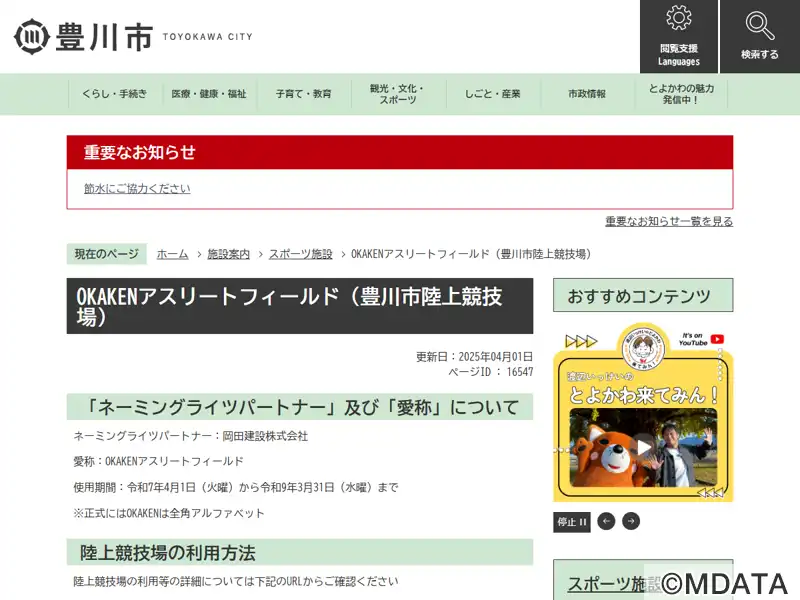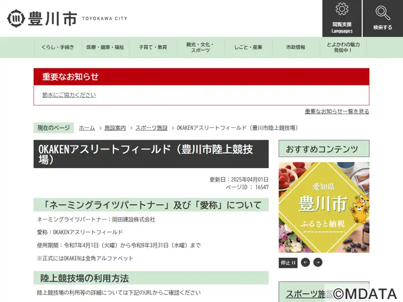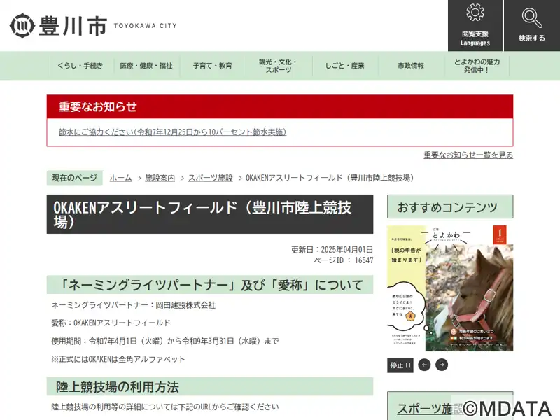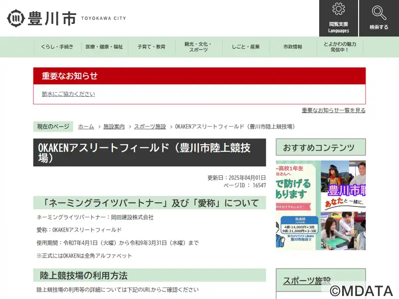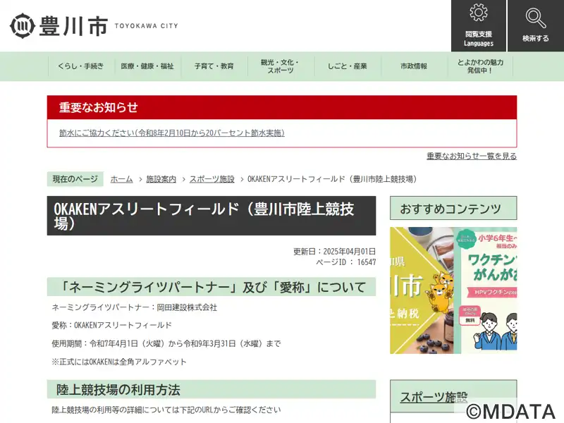 愛知県の豊橋公園内に1978年開場した日本陸連第3種公認の陸上競技場。2012年に改修リニューアル実施。全天候型400mトラック8レーン、115m直走路9レーン、天然芝のインフィールドを備え、陸上競技、サッカー、グラウンドゴルフに利用可能。個席スタンドおよび芝生スタンドに合計約1万人収容。ナイター照明もあり、豊川市のスポーツ振興の拠点として活用されている。2025年4月から岡田建設が命名権取得。