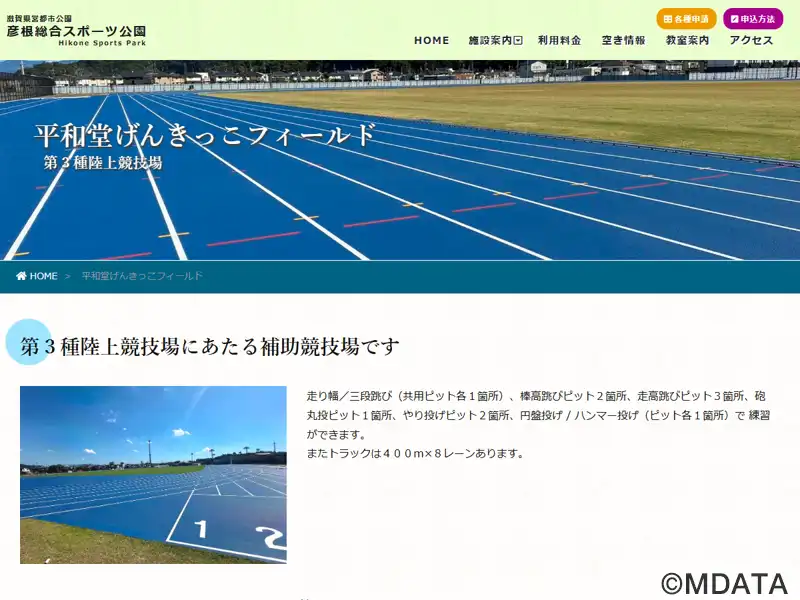 2023年4月オープンの彦根総合スポーツ公園補助競技場は、全天候型ブルートラック400m×8レーン、サッカー大会も可能なインフィールド(107m×71m)をもつ第3種公認陸上競技場。サブトラックとして敷地拡張エリアに新整備された施設。22ヘクタールの園内に彦根城を眺望するエントランス広場、緑の広場、庭球場、野球場(既存施設)、ジョギングコースを配置。ネーミングライツ愛称「平和堂げんきっこフィールド」