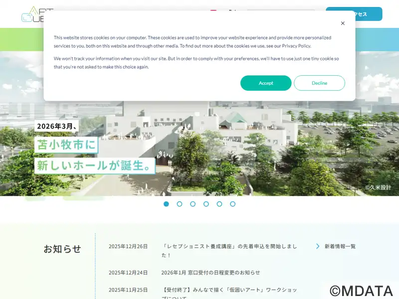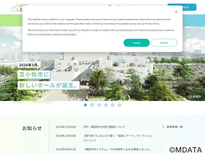 苫小牧市に2026年3月に開業を予定している複合公共施設。「とけだす・つながる・ひろがる」をコンセプトに、市民会館、文化会館、労働福祉センター、交通安全センターの機能を統合。文化会館には2つのホールを備え、コンサートや発表会、集会、式典など多様なイベントに対応。多目的室はリハーサルや会議、レセプション、ダンス練習などに利用できる。また、展示ギャラリー、美術室、練習室、音楽スタジオ、和室を備える。