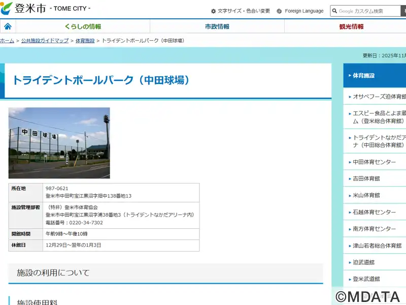 宮城県登米市中田町に1979年開場した、両翼90m、センター112mの外野天然芝の野球場。鉄筋コンクリートのバックネット裏観覧席や内野の芝生エリア、ナイター施設、スコアボード、ダッグアウトなど充実した設備を備える。週末を中心に少年野球、中学生、アマチュアチームの試合や練習、野球教室が開催される。2024年5月よりトライデントシーフード・ジャパン・登米プラント株式会社の命名権取得により現愛称となる。