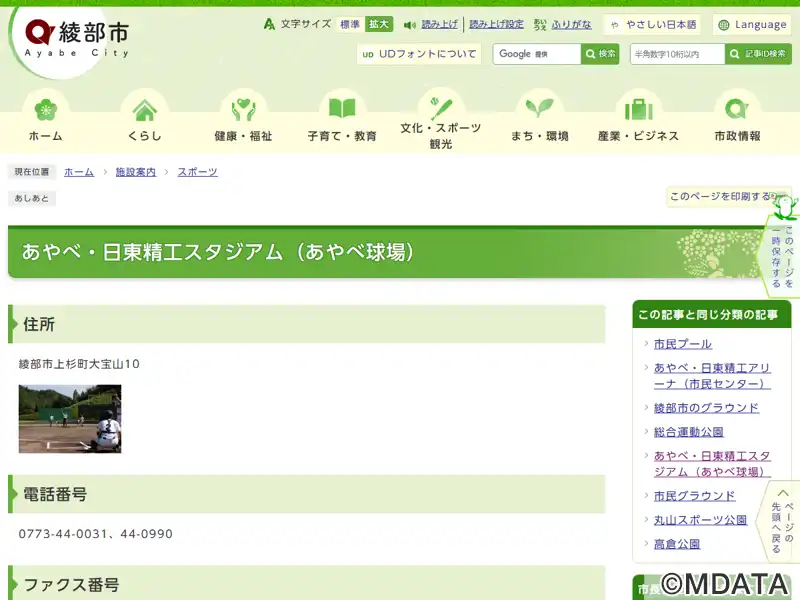 京都府の綾部市総合運動公園内にある野球場。2000年に設置され、両翼101m、中堅123m、内野は黒土混合土、外野は天然芝で整備されている。メインスタンドや内野席、外野席に最大5,800人収容可能。2024年にLEDスコアボードが導入され、全国高等学校野球選手権京都大会、地元の少年野球やアマチュアの試合、練習に利用されている。2022年から、日東精工株式会社による命名権取得により現愛称となった。