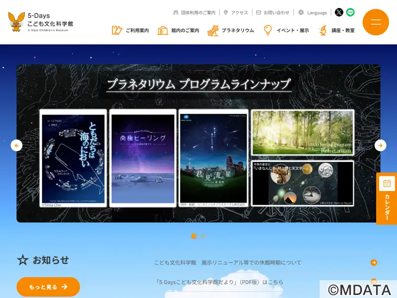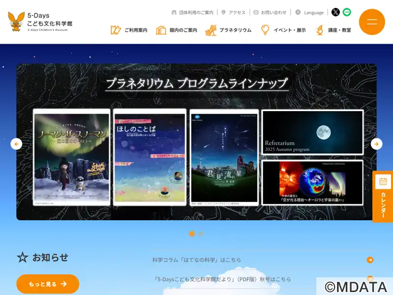 1980年に開館した広島市立の科学博物館。参加体験型の常設展示とプラネタリウムを中心に、子どもたちに科学への興味や理解を深める体験を提供する。科学の実験ショーを行うサイエンススタジオや、演奏会や文化イベントが行えるアポロホール、企画展示ホール、実習室、工作室、創作室を備え、さまざまな展示や教室、クラブ活動を開催している。2023年から、株式会社5コーポレーションの命名権取得により現愛称となった。