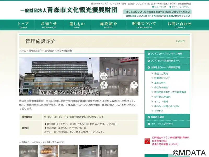 青森市民美術展示館は、1979年に開館した市民のための美術展示施設で、2024年にJR青森駅東口ビル4階に移転リニューアルした。ギャラリーは、約562平方メートルの広さがあり、可動式の壁を利用して最大4つのスペースに分割可能。搬入用エレベーターも完備し、絵画、写真、書道、工芸品など、さまざまな美術作品の展示と鑑賞の機会を提供している。2024年から、協同組合タッケンの命名権取得により現愛称となる。