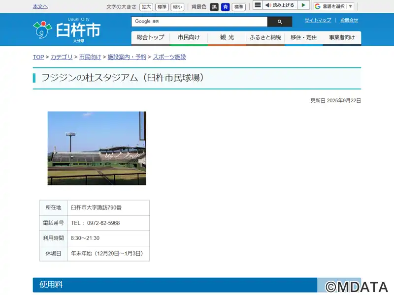 大分県臼杵市の総合運動公園内に1996年に開場した野球場。両翼98m、センター122m。内野は黒土混合土、外野天然芝で、照明設備、ブルペンやスコアボード、付属施設も充実。観客席はバックネット裏の屋根付きベンチ席と外野芝生エリアに最大7,400人収容可能。高校野球や独立リーグ・九州アジアリーグの試合、キャンプ地として利用されている。2022年から富士甚醤油株式会社が命名権取得。正式名、臼杵市民球場。
