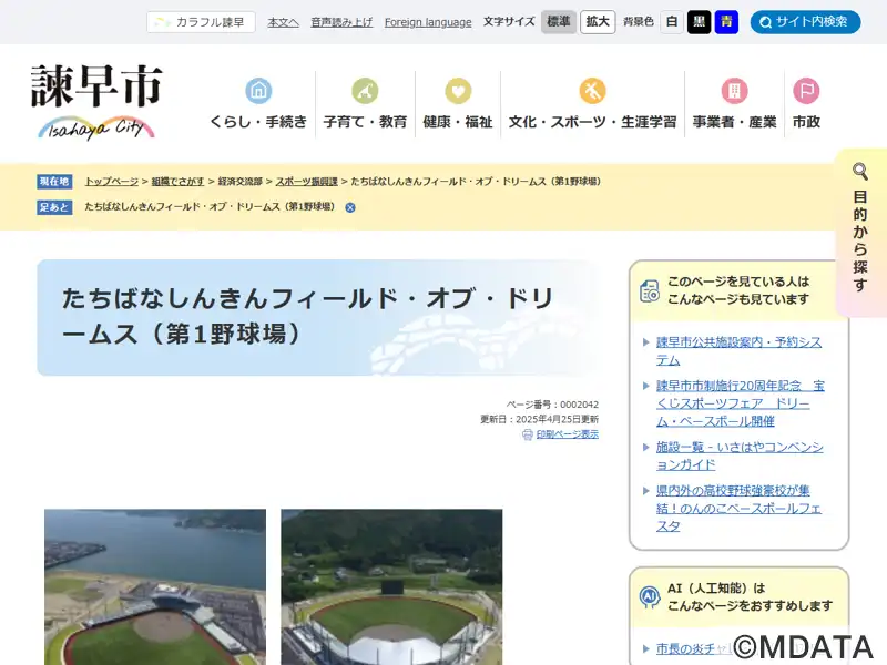 長崎県諫早市のスポーツパークいさはや内に2018年開場した野球場。両翼100m、センター122mの外野人工芝グラウンドに、フルカラーLED式スコアボード一体型のバックスクリーンや、最大収容人員7,200人のスタンド、控室や会議室など充実した設備を持つ市営球場。全国高校野球長崎県大会や、様々な大会が開催される。2024年から、たちばな信用金庫の命名権取得により現愛称となる。正式名、諫早市第1野球場。