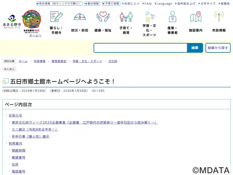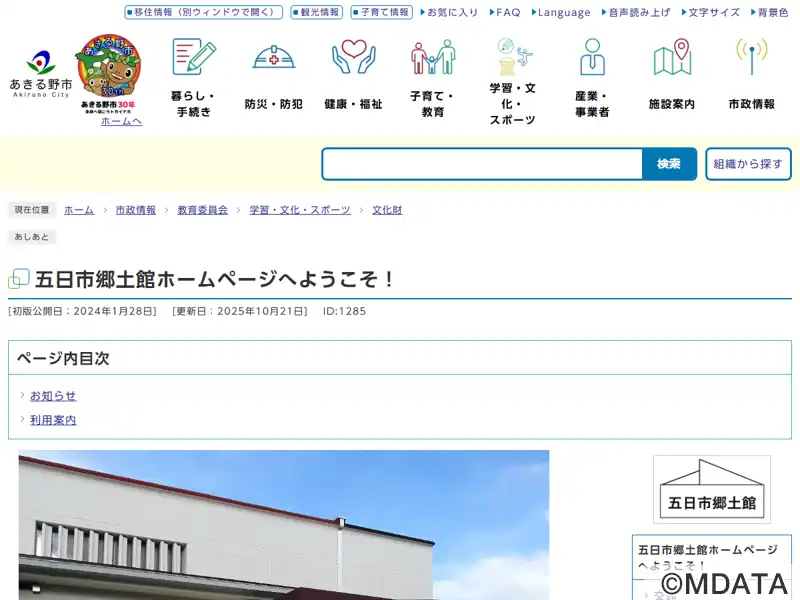 東京都あきる野市にある五日市地域の郷土資料館。1階では里山のくらしを反映した道具や、古生代・新生代の地層から発見された化石、海獣「パレオパラドキシア」の貴重な上顎骨の化石(レプリカ)が展示されている。2階には、明治期の憲法試案「五日市憲法草案」の関係資料が展示され、自由民権運動と地域の歴史を知ることができる。また、敷地内には市有形文化財の旧市倉家住宅があり、年中行事の展示が行われている。