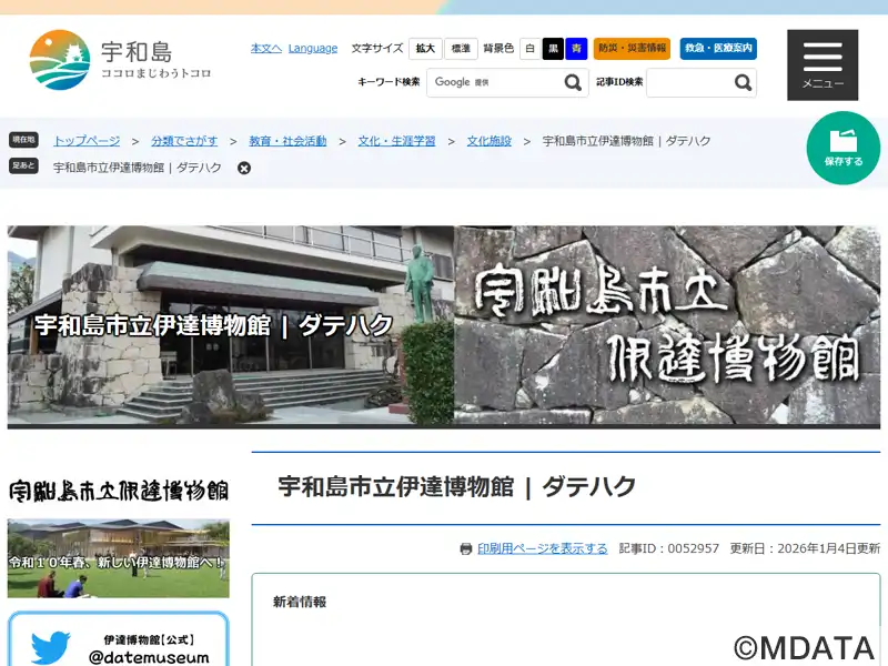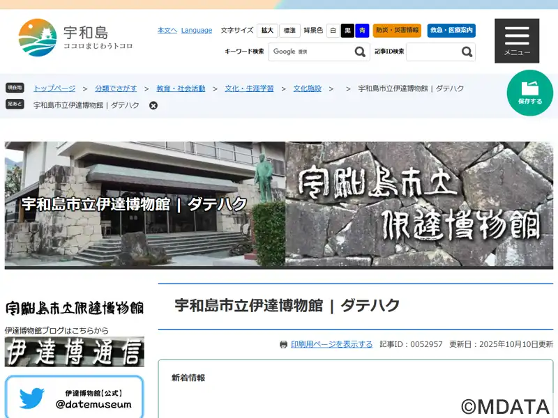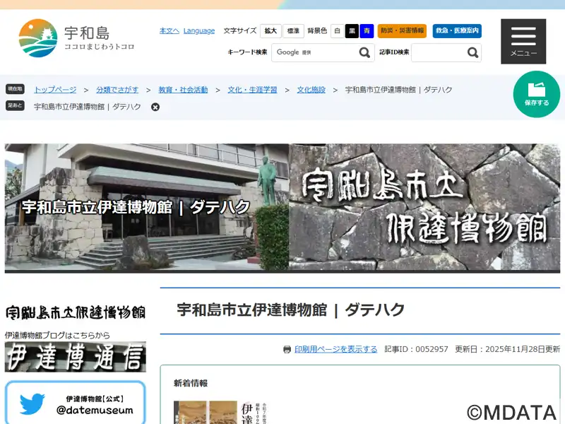 宇和島藩を治めた伊達家に伝わる貴重な文化財を公開する博物館。1974年、伊達家の屋敷跡に建てられ、歴代藩主が遺した古文書や武具、婚礼調度品など約4万点を所蔵している。宇和島伊達家コレクション展や、特別展などが開催され、現存する貴重な豊臣秀吉の肖像画(国指定重要文化財)は毎年、期間限定で公開されている。敷地内に、江戸中期の庭園の一部を復元した「皆楽園跡」があり、年代を経た樹木と石組の妙を堪能できる。