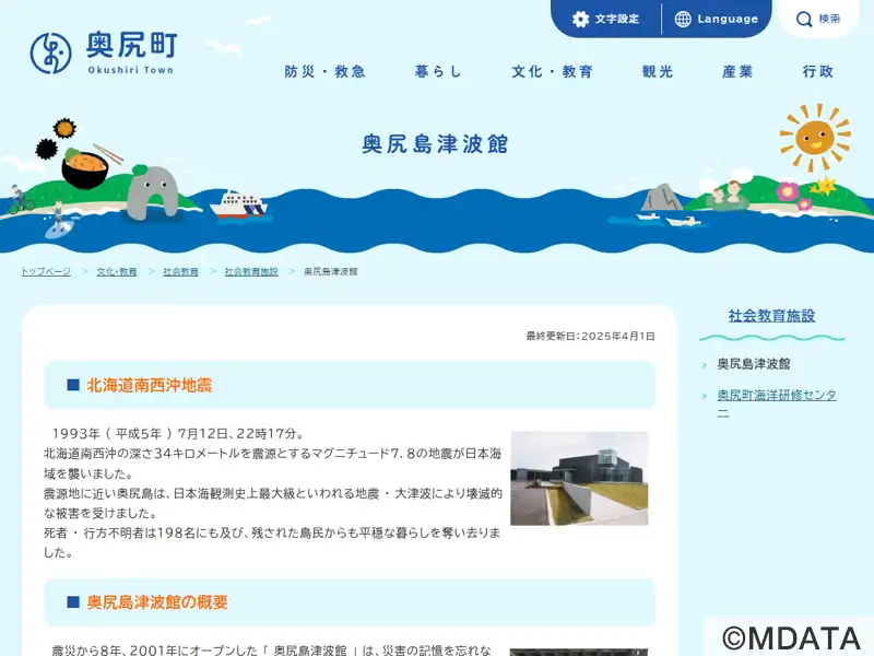 2001年に開館した北海道奥尻町の資料館。北海道南西沖地震(1993年)の災害記憶と教訓、復興の過程を次世代に伝えることを目的に設置された。7つの展示スペースを設け、犠牲者を追悼するステンドグラス「198のひかり」や、奥尻島の歴史から地震発生、救助活動と復興まで描いた立体模型などがある。また、映像ホールでは災害のドキュメント映像が上映され、遺跡展示室では島内で発掘された考古資料も展示されている。