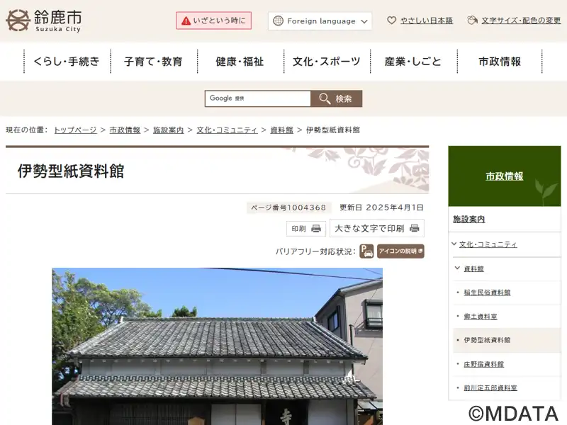 江戸時代末期の型紙問屋「寺尾斎兵衛家」の住宅を修復して、1997年に開館した資料館。伊勢型紙に関する資料を収蔵・展示し、伊勢型紙の美と伝統技術を紹介している。伊勢型紙は、和紙を用いて反物の染色に使われる道具で、その技術は国の重要無形文化財に指定されている。職人による彫刻実演も行われ、型紙彫りの技巧や、作業の様子を間近で見ることができる。建物は、町家建築の代表例として鈴鹿市指定史跡となっている。
