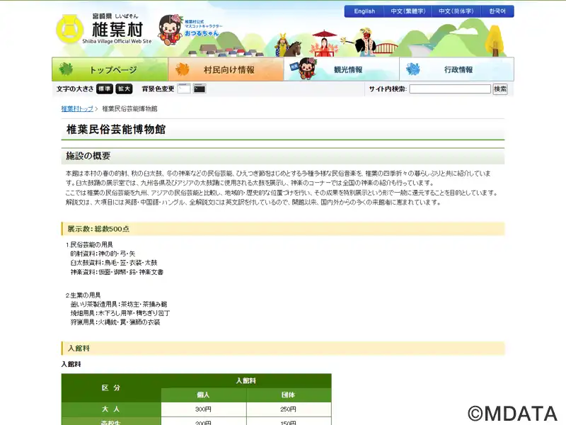 宮崎県椎葉村の民俗文化を保存・伝承する施設として1997年に開館。重要無形民俗文化財に指定されている「椎葉神楽」、春の的射、秋の臼太鼓踊りなど、四季を彩る行事と民俗芸能、ひえつき節などの民謡をはじめ、九州・アジアの民俗芸能も取り上げている。また、日本民俗学の父・柳田國男による狩猟伝承の記録や当時の交流資料も展示され、椎葉村に伝わる民俗文化と生業、自然との深いつながりを感じられる内容となっている。