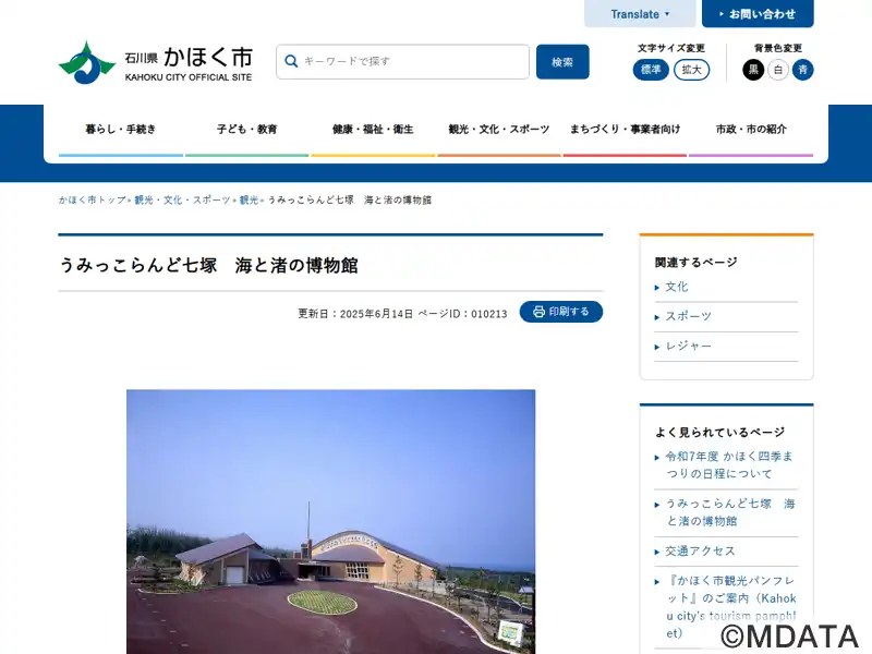 石川県かほく市にある、能登半島の漁村文化と人々の海との関わりをテーマにした博物館。船をイメージした建物は、日本海と調和したデザイン。館内では、昭和初期から30年代にかけて使われていた漁具類や生活道具など、3,000点以上の民俗資料が展示され、昔ながらの漁師の暮らしを再現したリアルな展示とわかりやすい解説で、失われつつある伝統的な漁業文化を紹介している。櫓こぎ体験や貝殻アートの工作体験もできる。