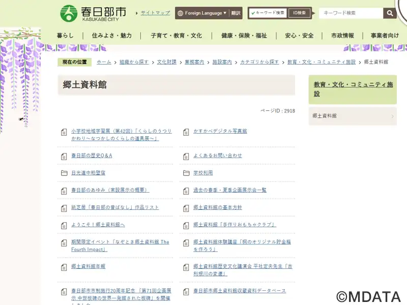 1990年に開館した春日部の歴史と文化を紹介する資料館。春日部市教育センター1階に位置し、常設展示では、原始・古代から現代までの春日部のあゆみを、復元竪穴住居模型や粕壁宿の町並み模型など約360点の展示資料で解説している。また、年3回の企画展示、講演会や体験講座、古文書講座が開催され、小学校地域学習展「くらしのうつりかわり」では懐かしい道具やおもちゃが並び、子どもも大人も楽しめる内容となっている。