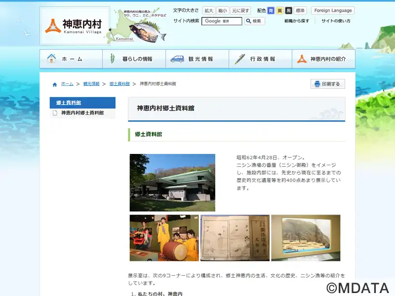 北海道の神恵内村に1987年に開館した資料館。青少年旅行村の敷地内にあり、ニシン漁場の番屋をイメージした外観が特徴。館内には、約400点の展示物が並び、先史時代から現代までの神恵内村の歴史と文化が紹介されている。9つのテーマごとに分けられた展示コーナーでは、村の自然や動植物、ニシン漁の歴史や漁具・ジオラマ、行政の移り変わり、伝統文化の「川白神楽」など、実物資料と写真、映像などで詳しく解説している。