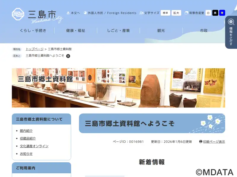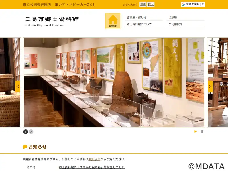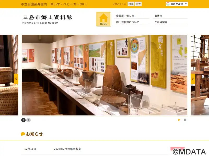 三島市立公園「楽寿園」内に位置し、三島の歴史・民俗を紹介する博物館。1階では、様々な視点で郷土の魅力を掘り下げた企画展を開催。2階では、職人の道具や古い農家の家屋を一部復元した展示を通じて、昔の生活を体験できる。3階では三島の成り立ちをテーマに、旧石器時代から現代に至るまでの歴史資料や三島宿関係史料を展示している。また、近代の三島を伝える「花島家文書」 、人形作家・野口三四郎の作品も収蔵する。