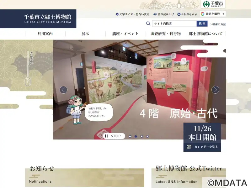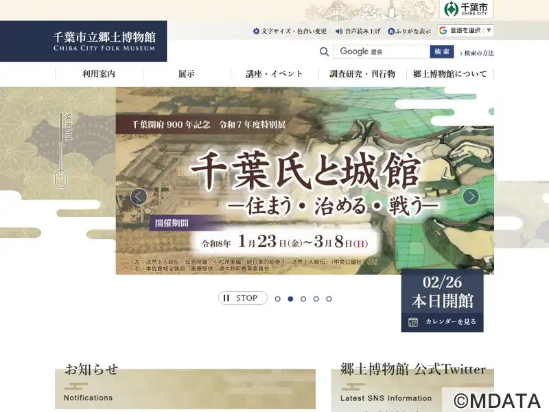 千葉市の亥鼻公園内にある郷土博物館。千葉市内の文化や文化財を保存・継承するため1967年に「千葉市郷土館」として開館、1979年に現在の名称となる。2025年11月には、千葉開府900年に向けて常設展示を全面リニューアルした。中世の千葉氏をはじめ本市の通史全般を網羅し、原始・古代から近現代までの変遷を楽しみながら学べる構成。郷土の歴史に関する多彩なテーマの企画展、講座や体験イベントなども開催する。