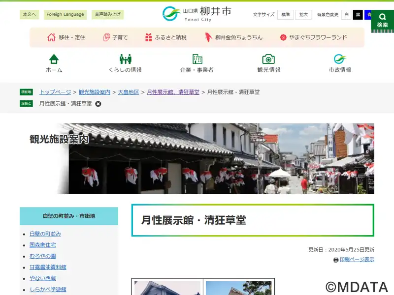 柳井市遠崎の妙円寺境内にある、幕末の海防論者で勤皇僧である月性(釈月性)にまつわる歴史を伝える施設。月性展示館では、月性に関わる書画、額画、巻軸、書冊などを展示し、その生い立ちや思想を紹介。文香と書写の製作体験も行なっている。一方、清狂草堂は、1848年に月性が開いた私塾で、多くの志士を輩出した場所として知られ、門弟により旧草堂を模した記念館として再建された。境内には墓碑など月性を偲ぶ史跡もある。