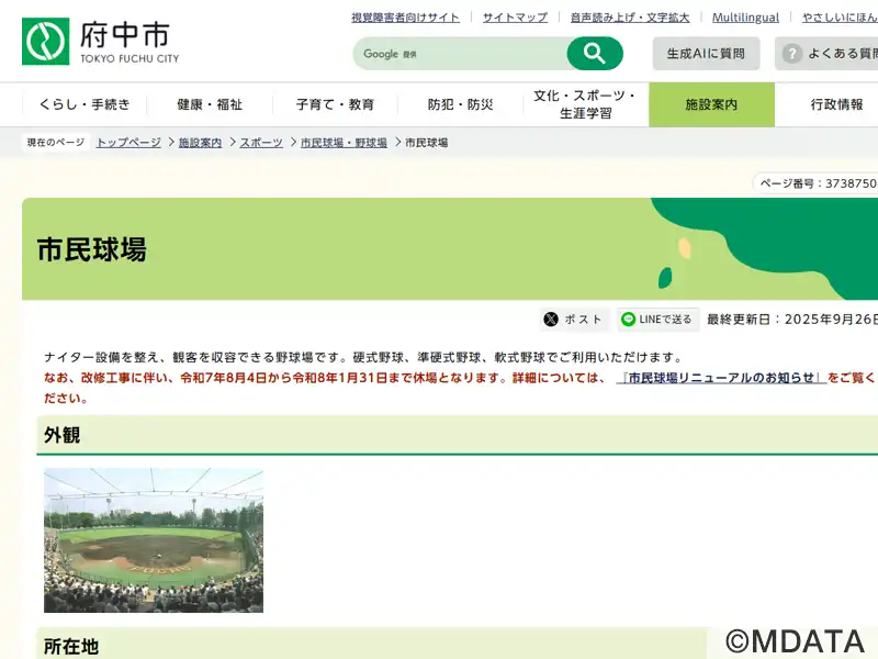 東京都府中市の府中中央公園内にある野球場。1950年に開場し、1982年に全面改築された。2023年からは「女子野球タウン」として、女子野球の普及推進の一環で改修が進められた。両翼95m、センター120mの外野天然芝グラウンドにナイター設備とLEDスコアボード、約5,000人収容可能な観客席を備える。プロ野球イースタン・リーグ、都市対抗野球東京都予選や高校野球西東京大会の公式戦が開催されている。