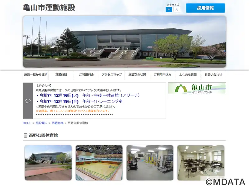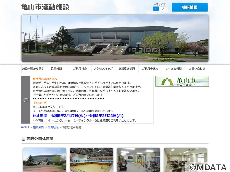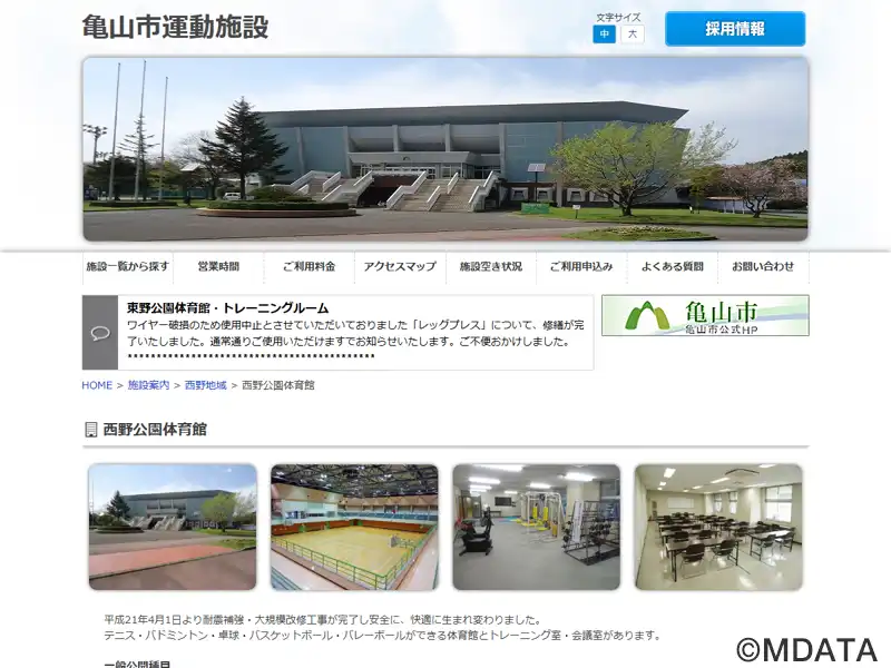 三重県亀山市の西野公園内に1983年に開館した体育館。2009年には耐震補強を含む大規模改修が行われ、2021年にはウエイトリフティング練習場が整備された。アリーナはバスケットボール、バドミントン、卓球、バレーボール、テニスなどに利用でき、Vリーグ・ヴィアティン三重のホーム公式戦も開催されている。また、トレーニング室、会議室、幼児室があり、幅広い年齢層を対象にしたスポーツ・健康教室を実施している。