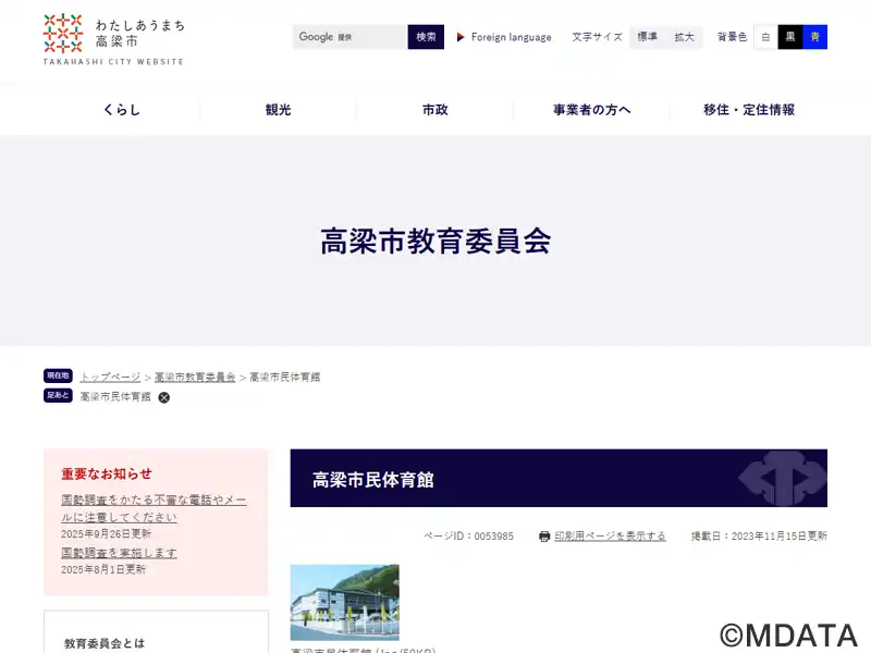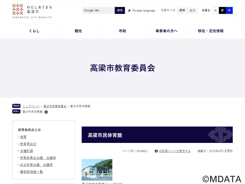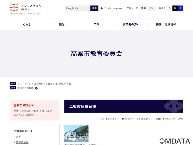 岡山県高梁市におけるスポーツ振興の拠点として1980年に開館した市民体育館。体操場には、バスケットボール・バレーボールコート2面、バドミントンコート6面が設置可能。様々な大会や、Vリーグ・岡山シーガルズの公式戦も開催される。2階に480席の観覧席と補助体操場、地階には柔道・剣道のための格技場、トレーニングルーム、クライミング体験施設が用意され、市民のスポーツ活動と健康促進の場として利用されている。