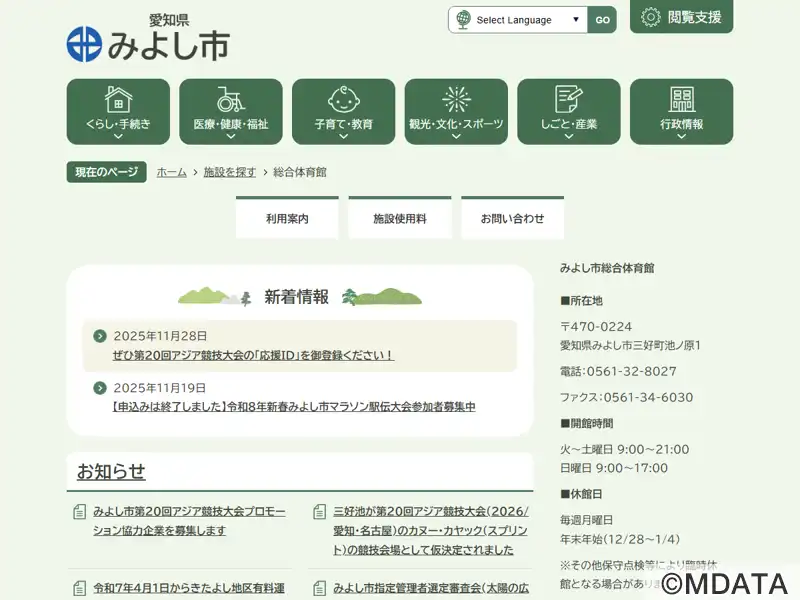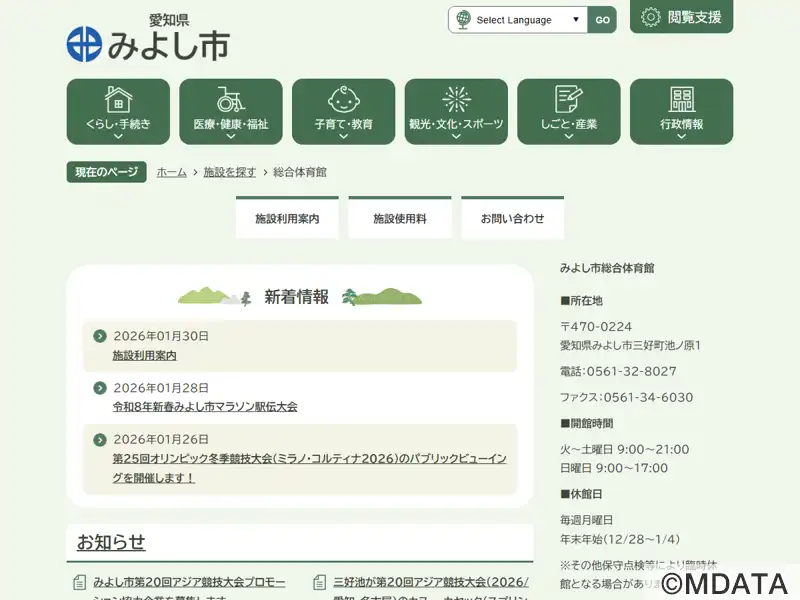 愛知県みよし市の地域スポーツの拠点として、1984年に開館した屋内スポーツ施設。メインアリーナは、バスケットボール2面、バレーボール3面のコートが設置可能で、弾性シートを採用したフロアと天井高12mの開放的な空間が特徴。Tリーグ・トップおとめピンポンズ名古屋の公式戦など各種大会やイベントも開催される。さらに、柔道場、剣道場、卓球場、トレーニングルーム、175mのランニングコースが設置されている。