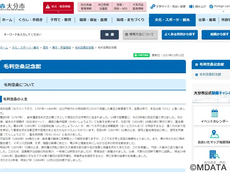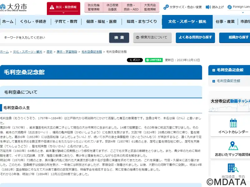 江戸時代末期から明治初期にかけて活躍した、儒学者で尊王の教育者である毛利空桑を記念して1985年に設立した施設。大分市鶴崎に位置する記念館は、県指定史跡である塾跡「知来館」と旧宅「天勝堂」、空桑の著述・詩作などの史料や文献、遺品を展示・収蔵する「遺品館」の3つから構成される。門下生は890人を数え、文武両道を信条とした教育、空桑の学問と思想、幕末から明治への激動の時代を知る貴重な文化財となっている。