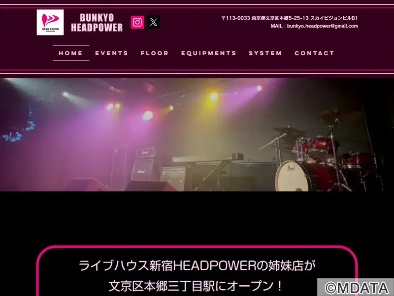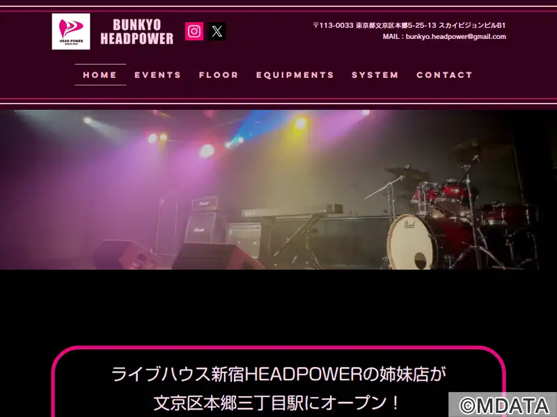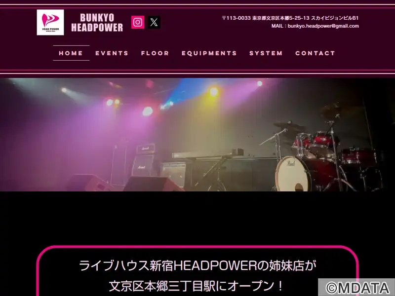 東京・文京区の本郷三丁目駅近くに2024年3月オープンしたライブハウス。新宿HEADPOWERの姉妹店。横長のステージと広々としたラウンジが特徴で、バンドからアイドルまで幅広いアーティストのライブや、各種イベント、パーティー利用にも対応。キャパは100人(着席50席)。丸テーブル4台と四角テーブル4台があり、物販やPC置き場として活用可能。ステージ直結の楽屋(約10畳)には専用トイレと更衣室も完備。