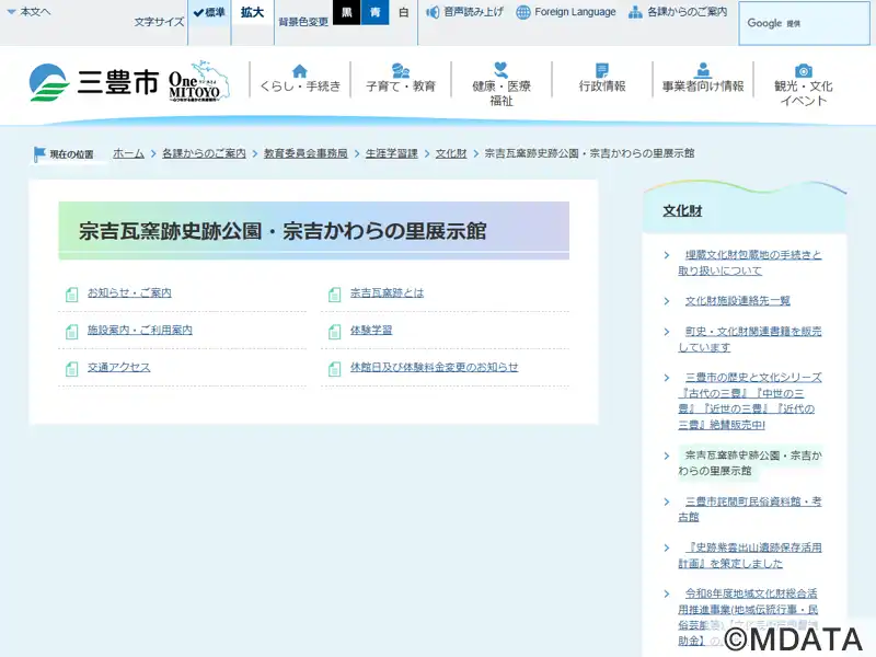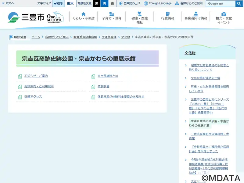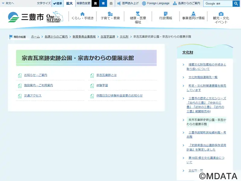 香川県三豊市の宗吉瓦窯跡史跡公園内に2009年に開館した、古代の瓦づくりの歴史を学べるガイダンス施設。史跡公園は藤原宮(694年造営)に瓦を供給した宗吉瓦窯跡として、国の史跡に指定されている。館内では、藤原宮の南面大垣の一部を古代の技術で復元した屋根をはじめ、瓦製造の様子を再現したジオラマや約130点の出土品を常設展示。また、古代の瓦窯群の景観を再現した屋外展示もあり、発掘現場の雰囲気を体感できる。