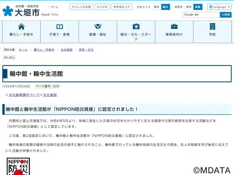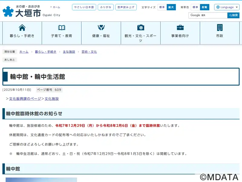 大垣市の木曽三川流域に見られる独特の治水文化「輪中」を紹介する歴史資料館として1992年に開館した。江戸時代から現代までの歴史や景観を、資料や模型でわかりやすく展示・解説している。輪中独特の民家の構造を再現した展示や、明治期の「十六輪中」の精密模型などが展示され、当時の人々の知恵や工夫が学べる。また、輪中生活館では、江戸時代から続く旧家・名和邸を公開し、輪中地帯の伝統的な民家の暮らしを体感できる。