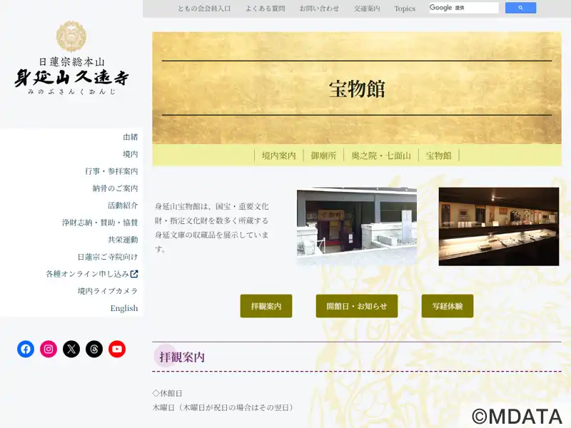 山梨県にある日蓮宗総本山・身延山久遠寺の宝物館。国宝・重要文化財・指定文化財を数多く所蔵する「身延文庫」の収蔵品を展示している。1926年に初代宝物館が建てられ、1985年には日蓮聖人700年記念事業の一環として、現在の本堂地階に移設された。収蔵品は約5,000点に及び、常設展示と年に数回の企画展で、貴重な宝物、絵画、経典、筆跡、工芸品などを展示公開。また、簡単な写経体験スペースも用意されている。