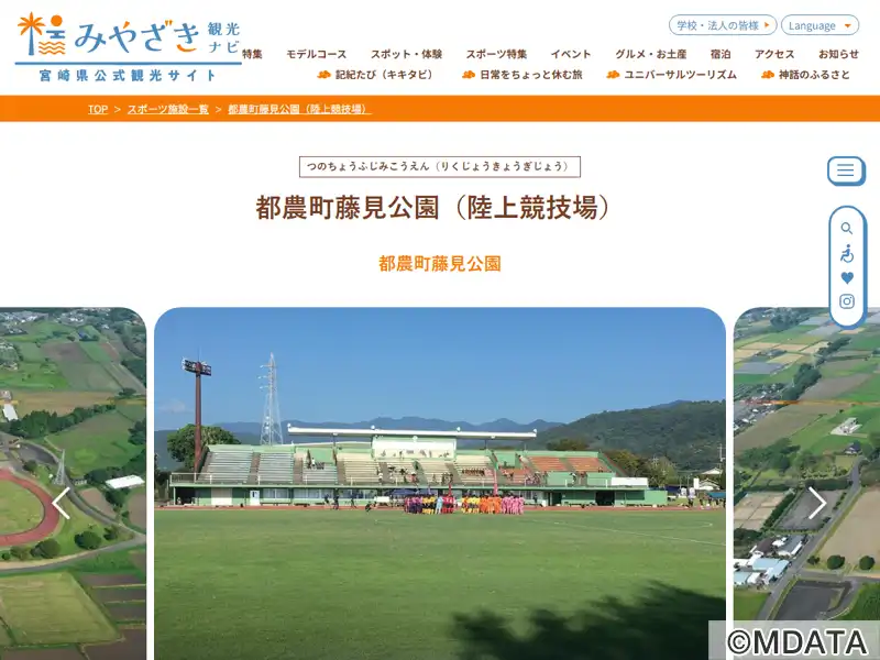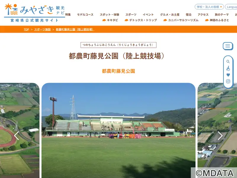 宮崎県都農町の藤見公園内にある、全天候型400mトラック8レーンをもつ日本陸連第3種公認の競技場。1994年に開場し、地元の学生や競技者のトレーニング、記録会などに利用されている。天然芝のフィールド、約1,128席のメインスタンドを完備し、JFLの公式戦も開催される。施設内にはシャワー室やミーティングルームあり。自然に囲まれた落ち着いた環境で、陸上競技やサッカーの合宿・トレーニングにも適している。